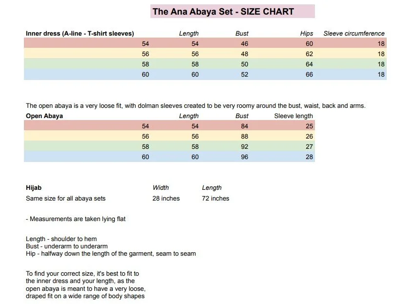 Abaya and inner slip dress are crafted from Nida fabric, ensuring ease of movement and modest flow. Hijab is chiffon.